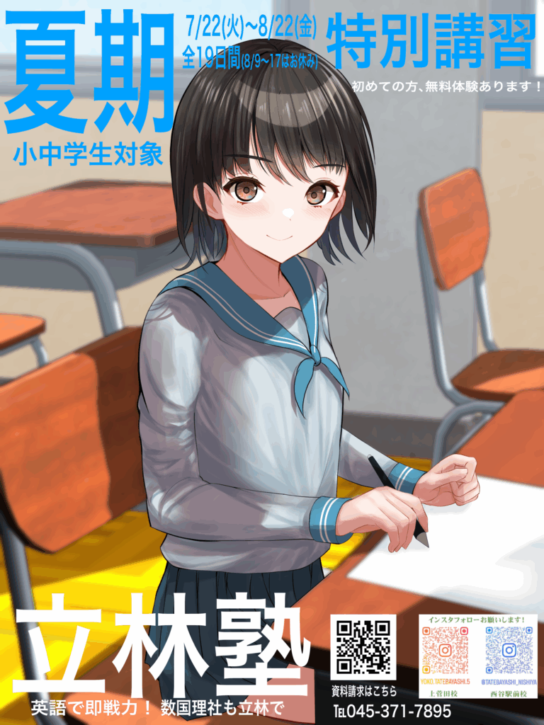 夏期講習のお知らせ 2025年6月20日 お知らせ 講習のお知らせ 教室ブログ 授業の様子 日々のこと ◆小学生 英語・国語・算数 ◆中学生 5教科(英語・数学・国語・理科・社会) ◆高校生 英語・数学 夏期講習の受付を開始しました。 URL Copied!